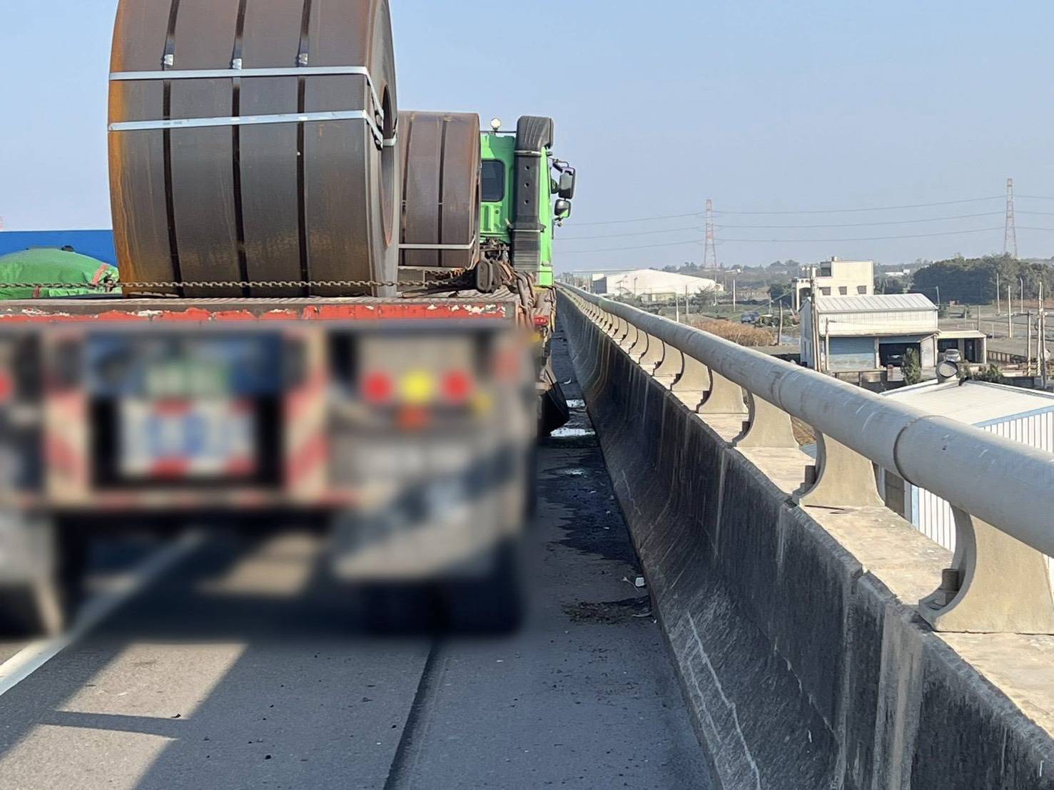駕駛表示,因為運送鋼圈途經此處,突然感覺車況有異,立即將車停到路邊:「還好有警察協助救援,並保護作業人員安全,才能安全並順利的解決突發情況。」。