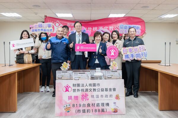 【記者葉志成 /桃園報導】 桃園市長張善政21日上午於市府,出席「財團法人桃園市世外桃源文教公益基金會食材處理機捐贈儀式」並頒發感謝狀,表揚基金會長期投入公益活動。張市長表示,世外桃源文教公益基金會多年來透過社會局管道,將各項捐贈物資送至最需要的市民手中,今(115)年再度捐贈819部食材處理機,總價值近新臺幣188萬元,為寒冬中的弱勢家庭帶來實質協助與溫暖。