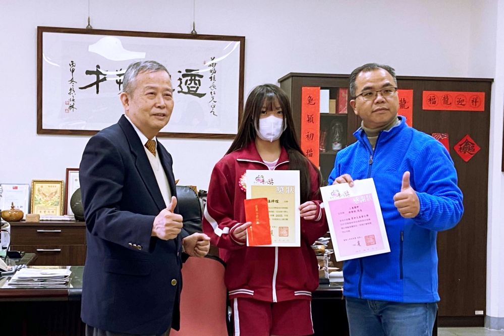 新湖國中八年級單親的陳邑柔,家中由媽媽獨力工作扶養4個小孩,還須償還鉅額債務,得靠政府補助支撐家計,經濟負擔常讓媽媽「壓力山大」。體貼的邑柔除了主動承擔洗衣服等家事分擔媽媽的辛勞,也總能在媽媽因壓力情緒低潮時扮演「小太陽」,給予媽媽最溫暖的陪伴。個性堅毅開朗,課業成績優異,並熱心協助同學,還積極參與舞蹈等校內外活動,曾獲新竹縣本土語言創意繪本競賽國中組佳作,展現多元才華。