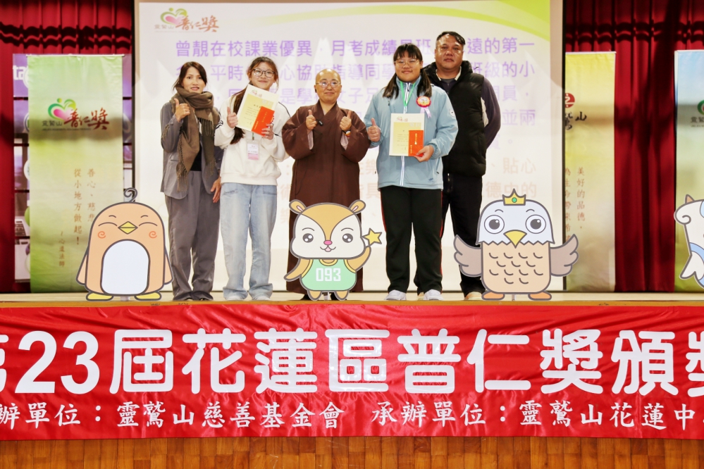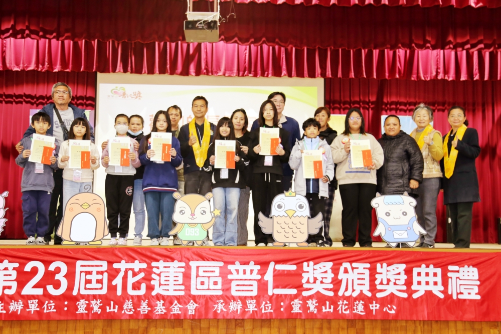 普仁獎由靈鷲山開山住持、普仁獎創辦人心道法師於2003年創立,23年來秉持「關心、愛心、慈悲心」服務社會的生命關懷理念,鼓勵身處困境卻仍堅守品德、勇敢迎向生命挑戰的孩子。累計訪視1萬6353個家庭、獎勵1萬3134位學生,許多曾被照亮的孩子,在成長後也成為照亮他人的力量,形成社會持續流動的善循環。今年經過學校師長慧眼挖掘、志工用心家訪及嚴謹評選,花蓮區共有36人榮獲普仁小太陽殊榮,國小19人、國中17人獲獎,其中林佳葳、曾靚脫穎而出,入圍全國普仁獎最高榮譽。