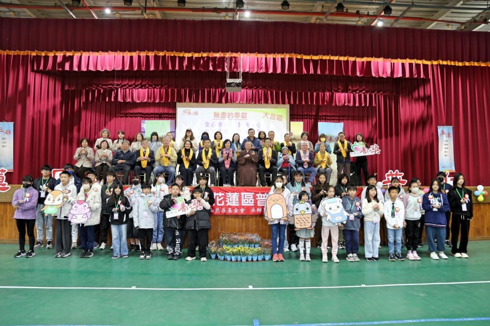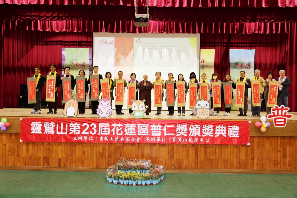 靈鷲山普仁獎花蓮區頒獎典禮,1月24日在去年洪災曾是重災區的花蓮縣光復商工學生活動中心舉行,花蓮縣教育處長翁書敏、花蓮縣議長辦公室主任張宸瑋、花蓮縣政府中區服務中心主任孫春玉、光復鄉公所機要李天崴、11位校長等眾多貴賓、師長、親友們都出席盛會。雖然外面是細雨緜緜的陰冷天氣,但36位得獎的小太陽與現場精彩的表演熱力四射,讓會場洋溢著溫暖,既榮耀又溫馨。
