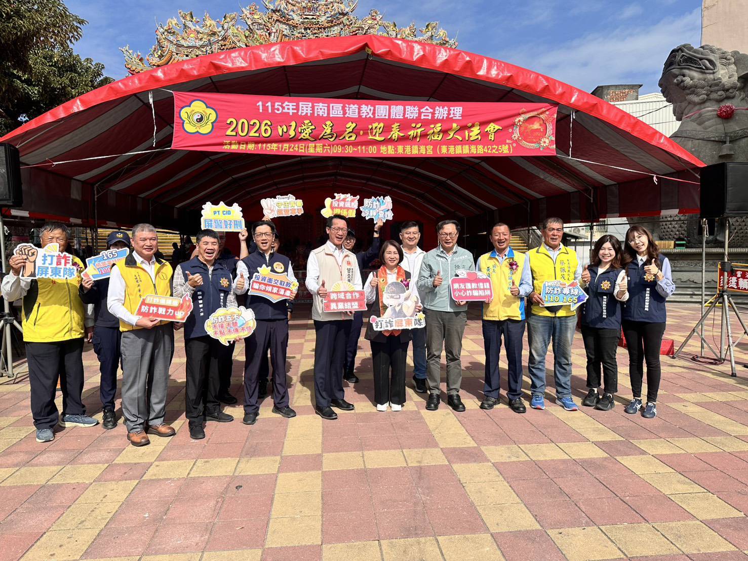 【記者 彭可可/綜合報導】屏南區道教團體於115年1月24日在東港鎮海宮聯合舉行「2026以愛為名 迎春祈福大會」,由屏東縣大家長周春米縣長率警察局長甘炎民暨各局處首長參與,現場亦有地方鄉鎮首長、中央及地方民意代表共襄盛舉一起為縣民祈福。
