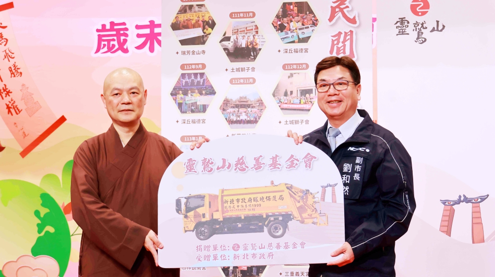 為協助新北市政府落實地方環境維護,靈鷲山秉持慈悲利他的精神,以實際行動投入城市永續關懷。1 月 24 日捐贈新北市政府環境保護局一輛「6 立方公尺密封壓縮式垃圾車」,撥配至貢寮區清潔隊使用強化第一線清運量能,這也是貢寮地區首度由民間機構捐助的清潔車。