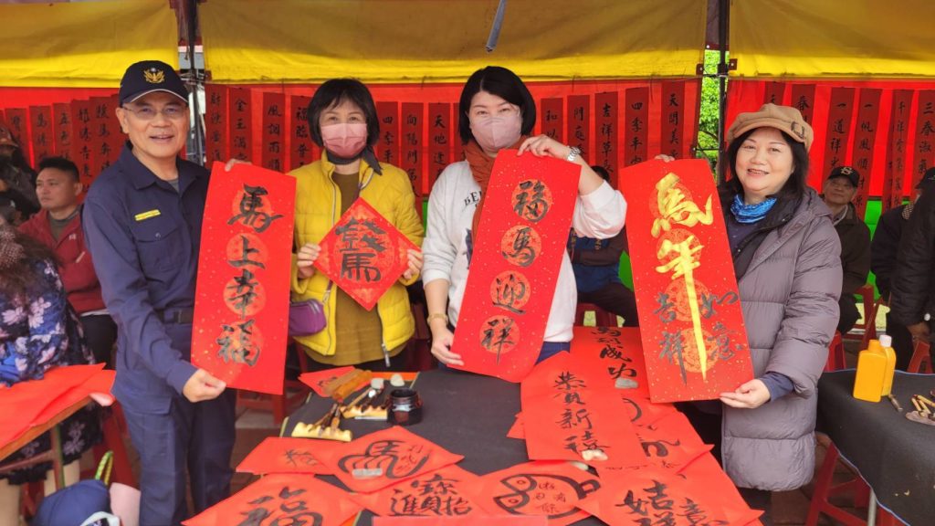 農曆春節將至,為讓鄉親在喜氣洋洋的氛圍中安心迎新年,臺東縣警察局關山分局鹿野分駐所所長陳泰山,於昨(25)日9時許,應邀前往鹿野地區「聖安宮」,參與「迎新春馬到成功全鄉贈春聯活動」,除親自揮毫書寫新春祝福春聯外,並率領所內員警結合大型手舉牌,向民眾宣導防詐騙、交通安全及115年加強重要節日安全維護工作等重點事項,期盼讓鄉親除舊佈新的同時,也能平安過好年。