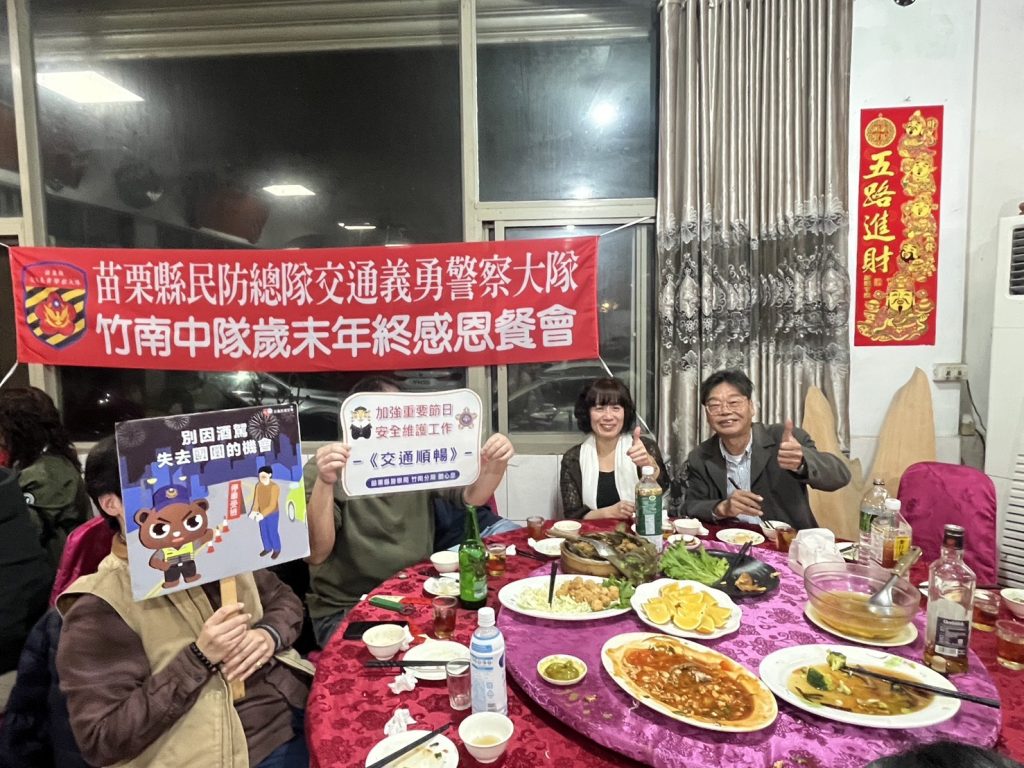 為感謝交通義勇警察一年來協助交通疏導之辛勞,竹南交通義警中隊特於115年1月24日在龍鎮餐廳辦理尾牙餐敘活動,並結合竹南分局進行交通安全宣導,藉由餐敘交流時機,強化交通安全觀念,共同守護用路人安全。