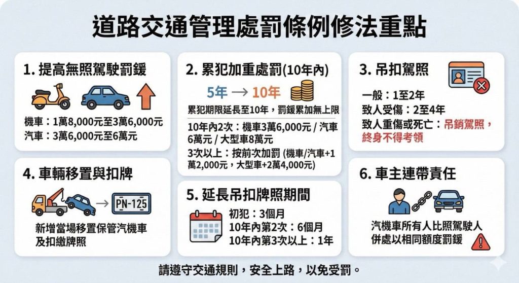 此次修法明確針對無照駕駛行為提高罰鍰額度,機車無照駕駛最高可處新臺幣3萬6千元,汽車最高可處6萬元,並延長累犯計算期間,對於重複違規者採取更嚴格的處分;同時,無照駕駛車輛得當場移置保管並扣繳牌照,藉此有效遏止僥倖上路的危險行為。相關修法於115年1月31日正式施行,警方呼籲民眾務必依法取得駕照後再行上路,切勿心存僥倖。