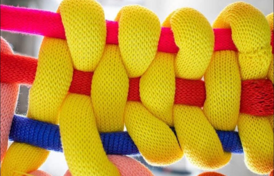 當原本縮小在腿上的毛線變成巨大的「針織麵條」並佔據整個展廳或公共建築時,實際上是在宣示:女性傳統勞動具備建築般的重量感與藝術主體性的能量。