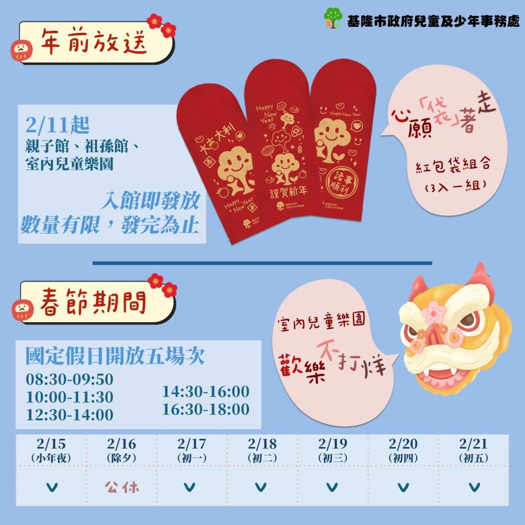 為迎接新春佳節,基隆市「室內兒童樂園」讓愛不打烊!全市七區室內兒童樂園春節期間除了除夕(2月17日)休館外,其餘天數皆正常開放服務;「親子館及祖孫館」則配合中央節慶放假,於2月15日至2月23日春節期間休館。