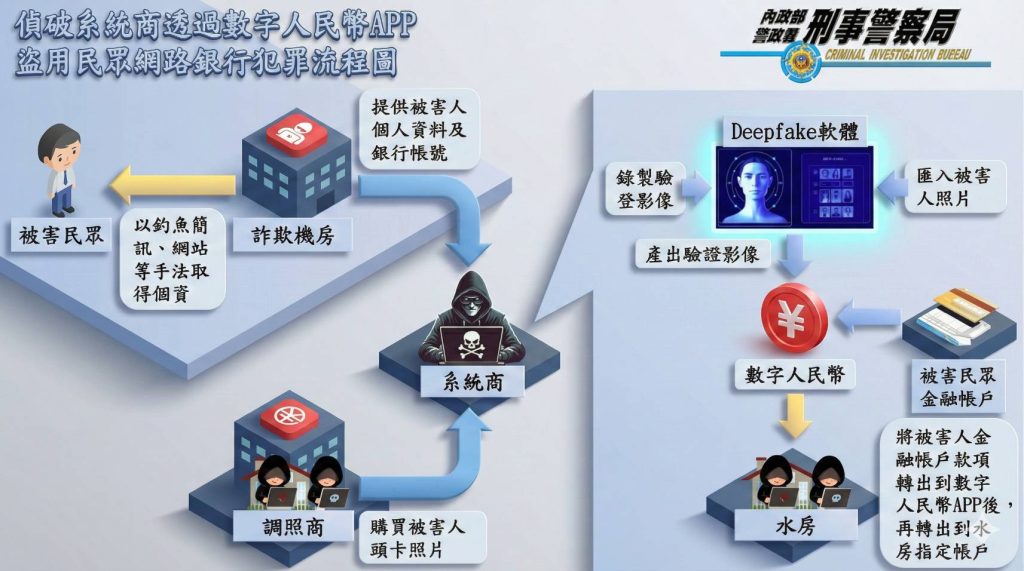 經查林嫌籌組之系統商除大量創設WeChat、QQ及Apple ID等帳號販售予境外詐欺機房使用外,另配合詐欺機房騙取大陸地區民眾個資後,利用深偽技術(Deepfake)製作被害人臉部驗證影片,順利通過「數字人民幣」APP身分驗證程序,以綁定被害人金融帳戶,藉此盜取移轉被害人存款。全案由臺灣臺中地方檢察署依詐欺犯罪危害防制條例、妨害電腦使用罪及組織犯罪防制條例等罪嫌,將林嫌等4人提起公訴。