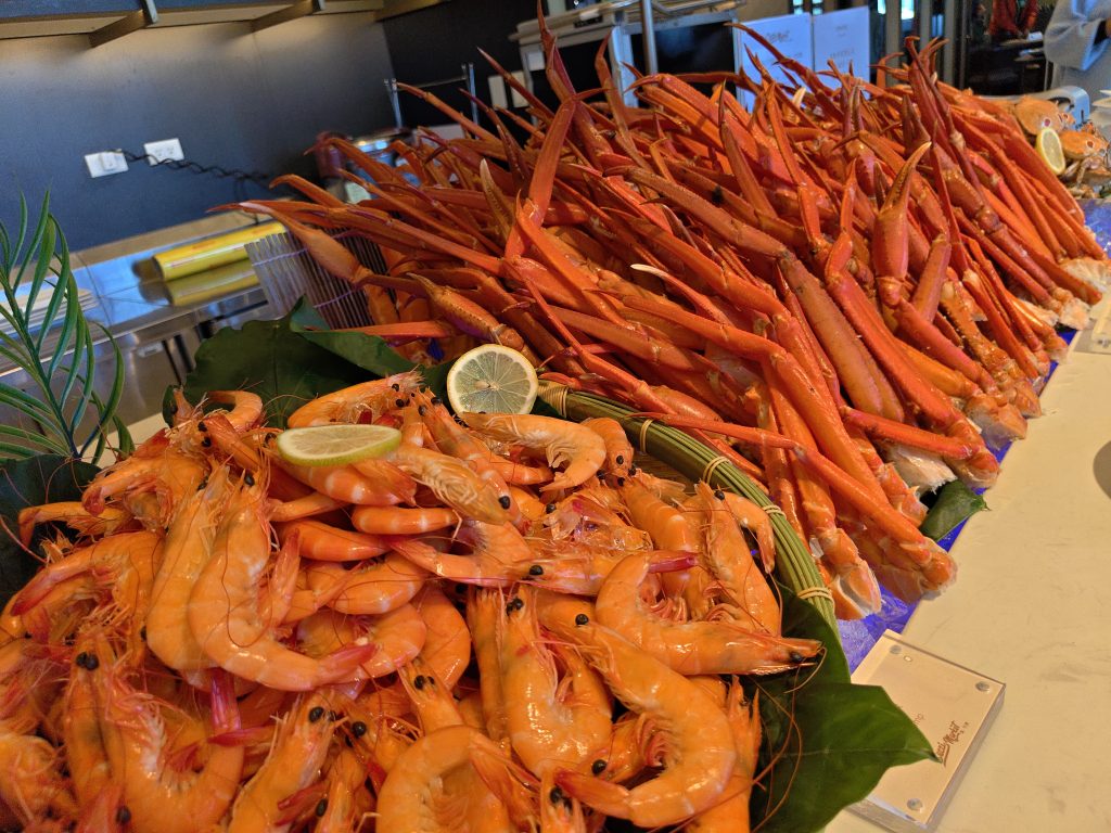 「集鮮.碼頭」提供三種螃蟹、鮮蝦、貝類等冰鎮海鮮,假日餐期更加碼供應鮮甜飽滿的雪蟹腳及肉質細緻的毛蟹腳無限享用,以及主廚特色海鮮料理,如佃煮槍烏賊、五香燻魚,彷彿置身海濱漁港,能品嚐到新鮮食材的純粹風味,是最受賓客矚目的餐檯之一。