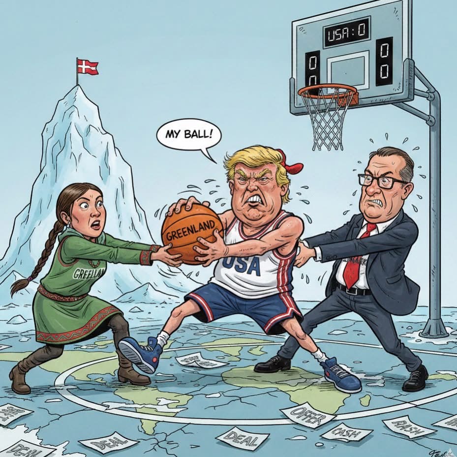 圖片繪製Dvjj 美國總統川普跟格陵蘭總理 丹麥總理三個人在搶籃球
