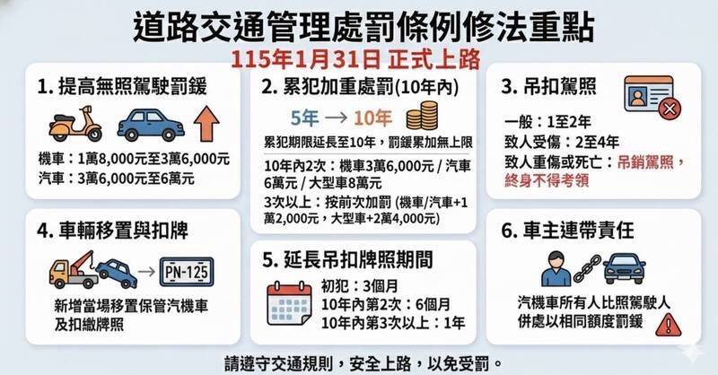 一、無照駕駛罰鍰提高:無照駕駛罰鍰上限機車提高至新臺幣(以下同)3萬6000元,小型車提高至6萬元,大型車更是提高至8萬元。