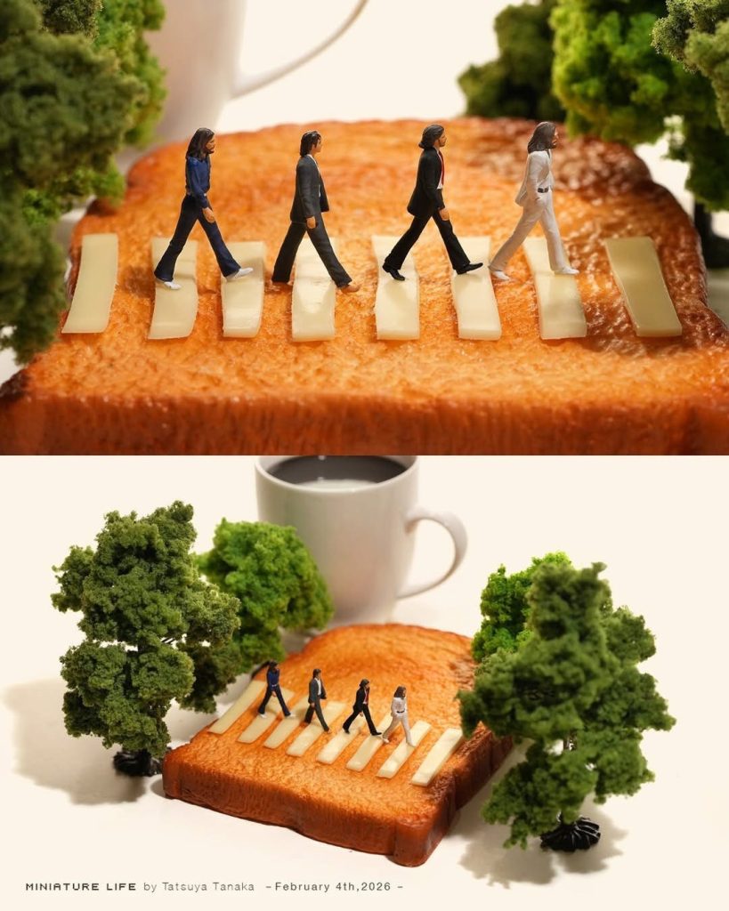 田中達也利用日常所見的吐司麵包,巧妙地將其焦脆的紋理轉化為斑馬線。作品中,四位微縮版的**披頭四(The Beatles)**成員正踏過這片「吐司大地」,完美致敬了傳奇專輯《Abbey Road》的封面圖景。這份創意不僅展現了他「將日常視為藝術」的獨特視角,更透過溫暖的麵包香氣,為全球樂迷帶來一場視覺與情懷的雙重饗宴。