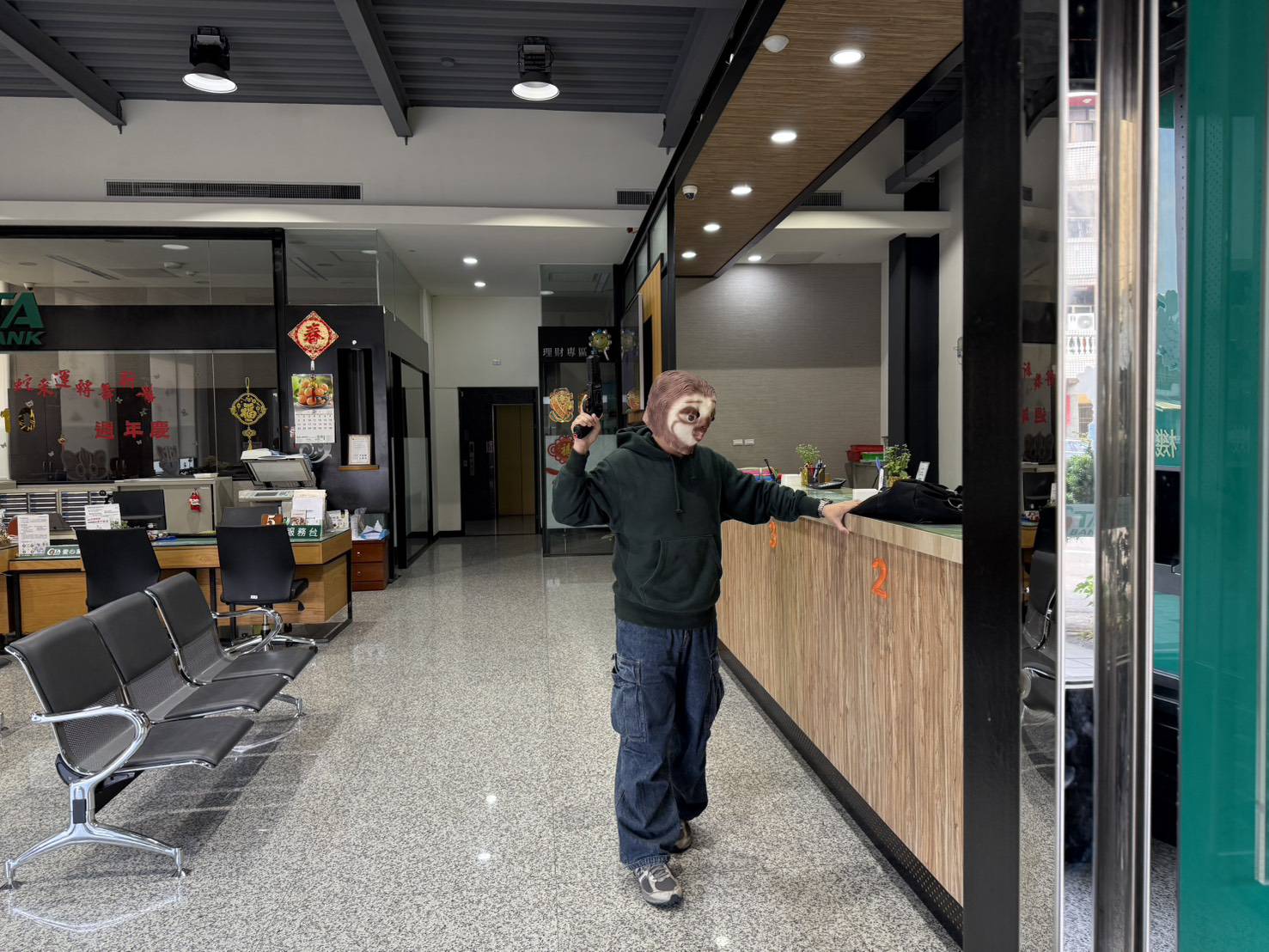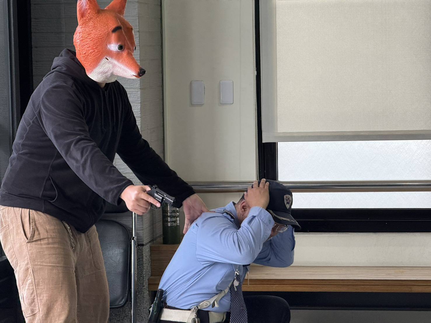 【記者 彭可可/綜合報導】新年將近,為迎接年節到來並強化金融機構防搶應變能力,警方特別結合創意元素,辦理一場別開生面的防搶演練。演練中,由兩名頭戴「動物方程式」人氣角色狐尼克與快俠(樹懶)頭套的歹徒,佯裝成街頭互動表演人員進入銀行,藉由可愛形象降低行員與民眾戒心,伺機持槍喝令行員交出現金,現場氣氛瞬間緊張。