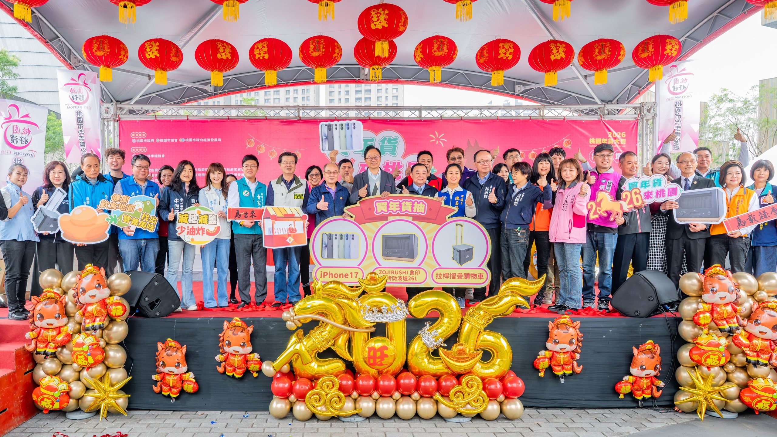張市長指出,農曆春節將近,許多市民朋友已開始採買年貨,桃園商圈與傳統市場匯集多元且物美價廉的優質商品,各式年節所需皆能在桃園一站購足。為刺激年節買氣,活動期間只要消費滿2,000元即可參加抽獎,有機會將iPhone 17等多項好禮帶回家。