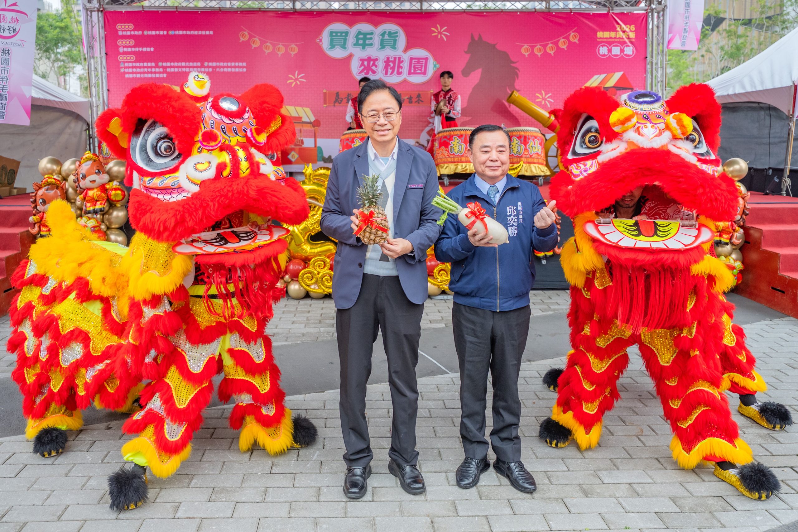張善政市長在市府青年局副局長塗淳惠、客家局副局長饒佳汶、農業局主任秘書劉秀卿、經發局專門委員廖振宏、桃園區副區長邱創正 陪同下,與桃園市議會議長邱奕勝、市議員黃婉如、林政賢、陳美梅、李光達、黃家齊、、桃園信用合作社理事主席蘇家明、桃園市商圈產業聯合會總會長張永隆、桃園市商業總會理事長范揚淇、桃園市伴手禮協會理事長林運鍾等一同出席「桃園年貨大街開幕記者會」。