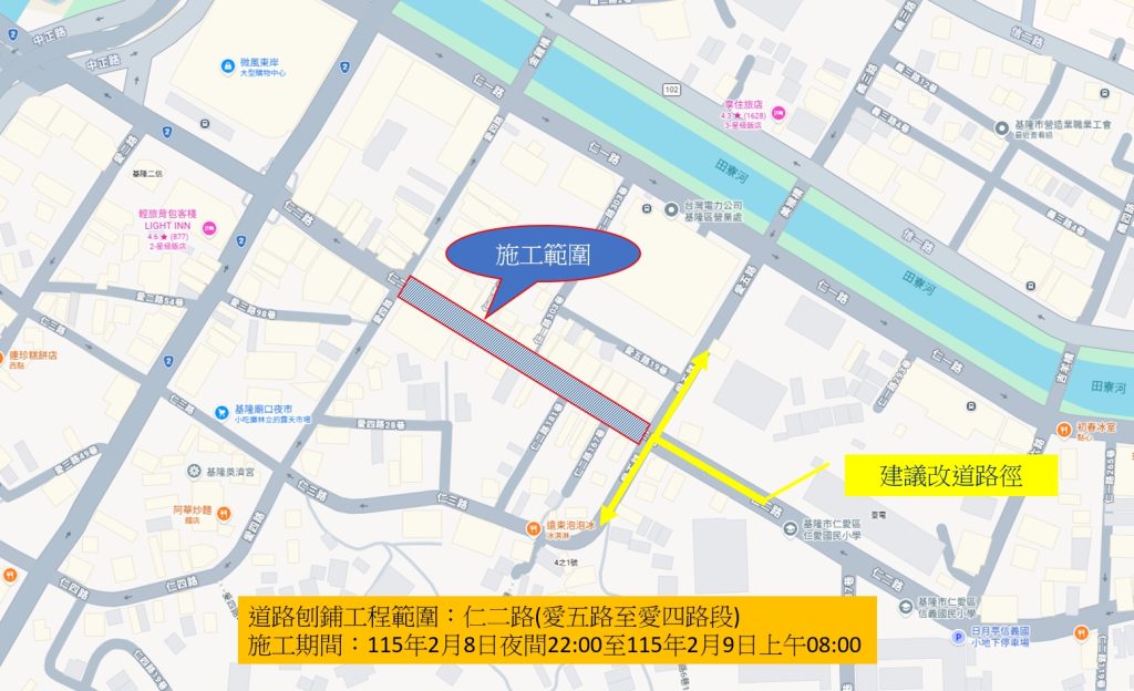 基隆市政府為持續精進市區道路品質,打造更平整、安全的通行環境,積極推動市中心交通熱區之路平計畫。市府將於115年2月8日夜間10時至2月9日上午8時,進行仁二路(愛五路至愛四路段)路面刨鋪作業。因市中心管線使用及維護需求龐大及商區周邊污水系統清淤無可避免,需留設部分孔蓋於路面,但為使路面高程一致,本次工程執行市府標準「道路維護四部曲」,期盼透過系統化的施工流程,徹底解決路面不平問題。