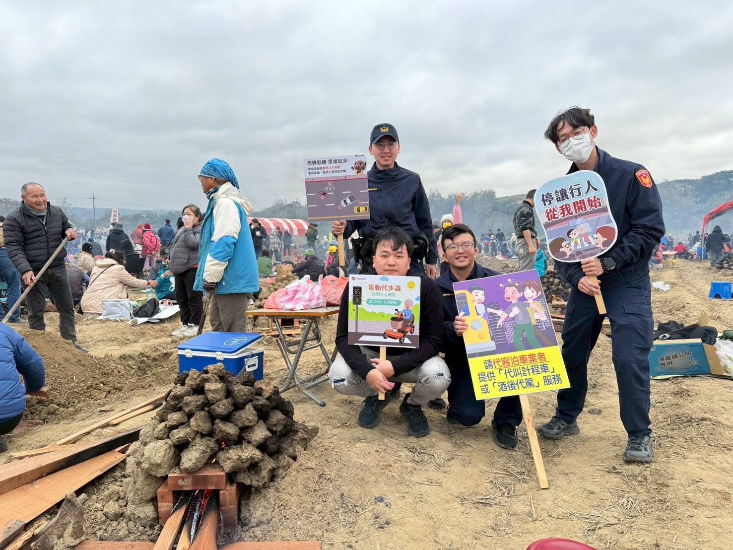 因應今日焢窯活動吸引大量都市遊客與返鄉青年參與,通霄分局特別在活動現場設立宣導站。針對新聞話題中的「小墳塚」誤會,警方幽默化用為主題,提醒民眾「看窯要專心,開車要留心」。現場由員警向家長與駕駛人發放宣導資料,針對春節期間容易發生的超速、疲勞駕駛及違規停車等行為進行重點提醒,有效利用單日活動的高流動性,將安全意識傳達給來自全國各地的遊客。