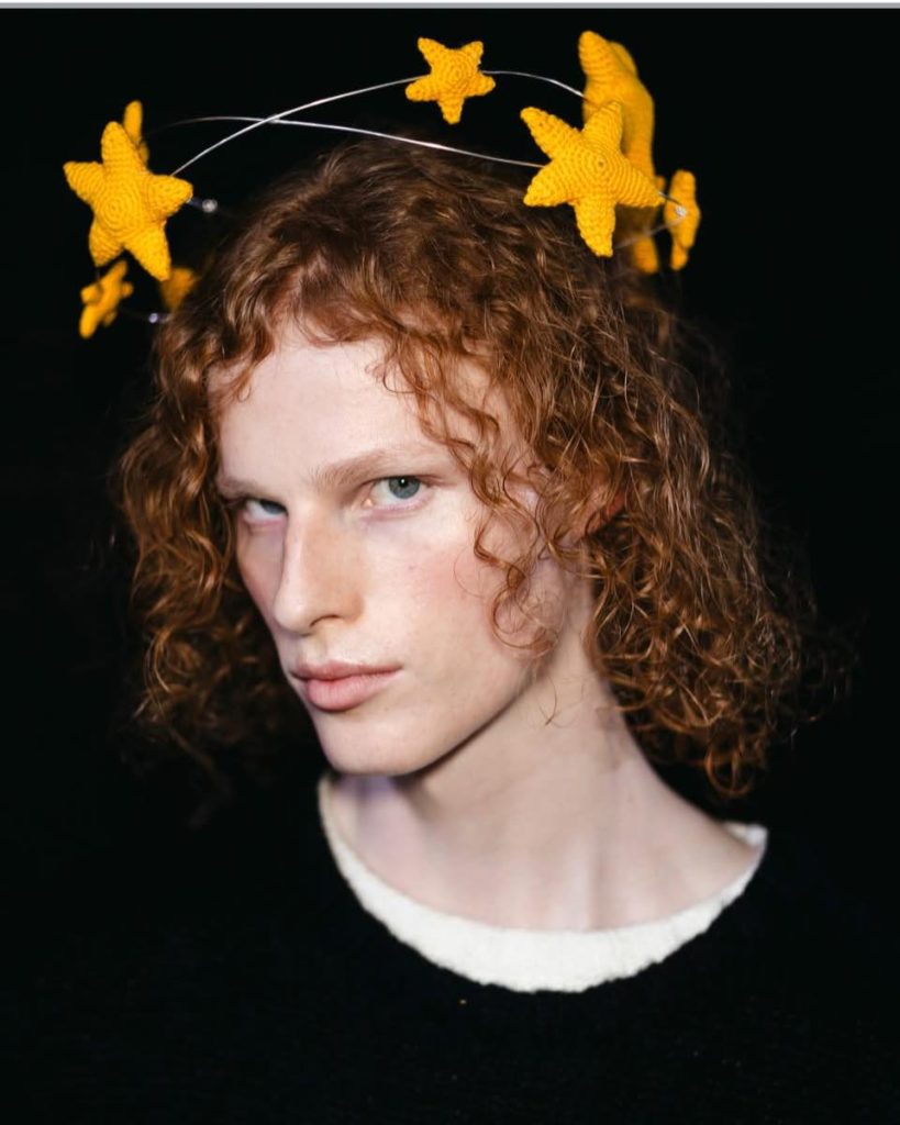 Nahmias 在這一季的設計中,手工編織的延續,可以看到模特兒配戴著黃色針織星星頭飾,以及穿著具有豐富紋理、類似手工勾勒感的深色毛衣。體現了當代時尚如何將傳統編織技法轉化為具有現代感的配飾,讓手工藝在高端街頭服飾(High-street wear)中重獲新生。