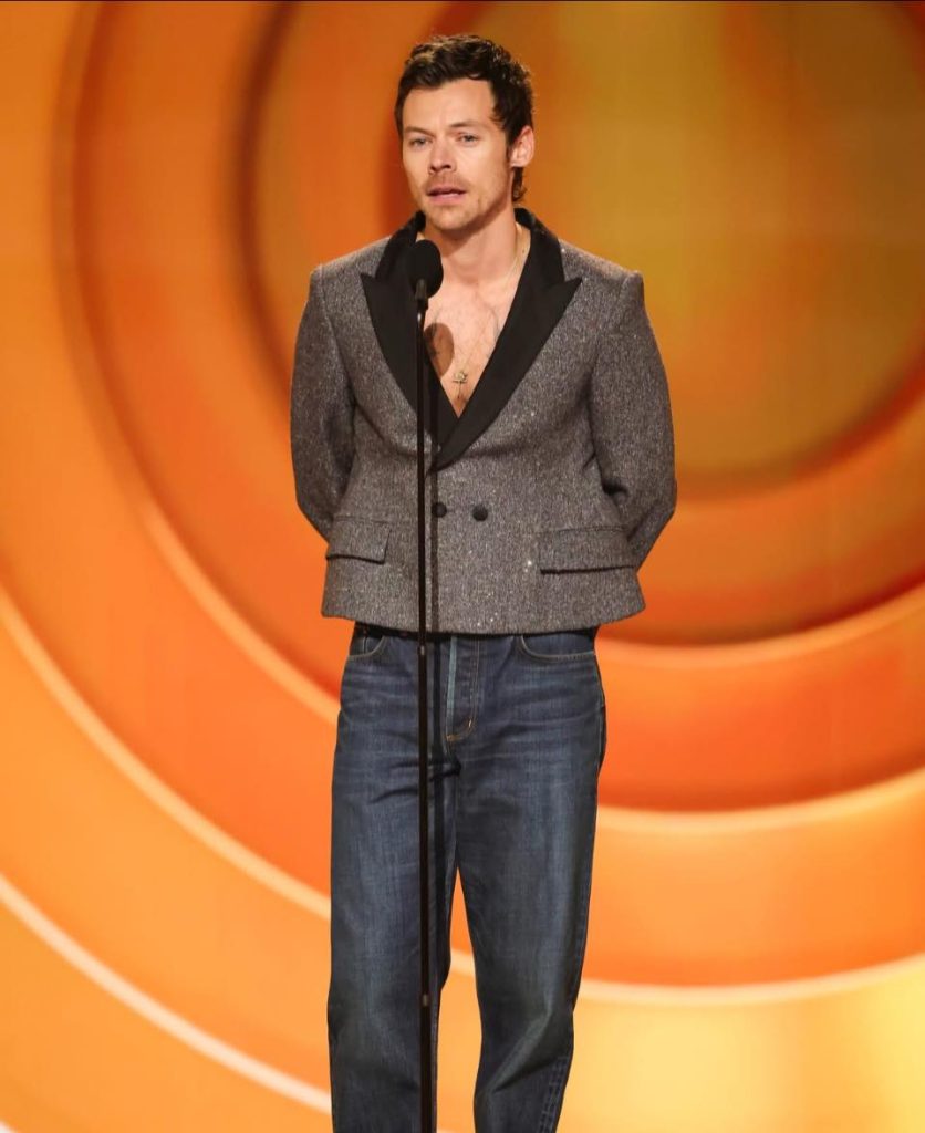 短版、微收腰、雙排扣的灰色粗花呢外套,明確回指 Bar Jacket 的經典輪廓,但關鍵在「去神聖化」:Harry Styles直接搭配水洗牛仔褲,一副毫不修飾的"站台",把 Dior 最經典的象徵,拉回日常、拉上身體、拉入真實。
