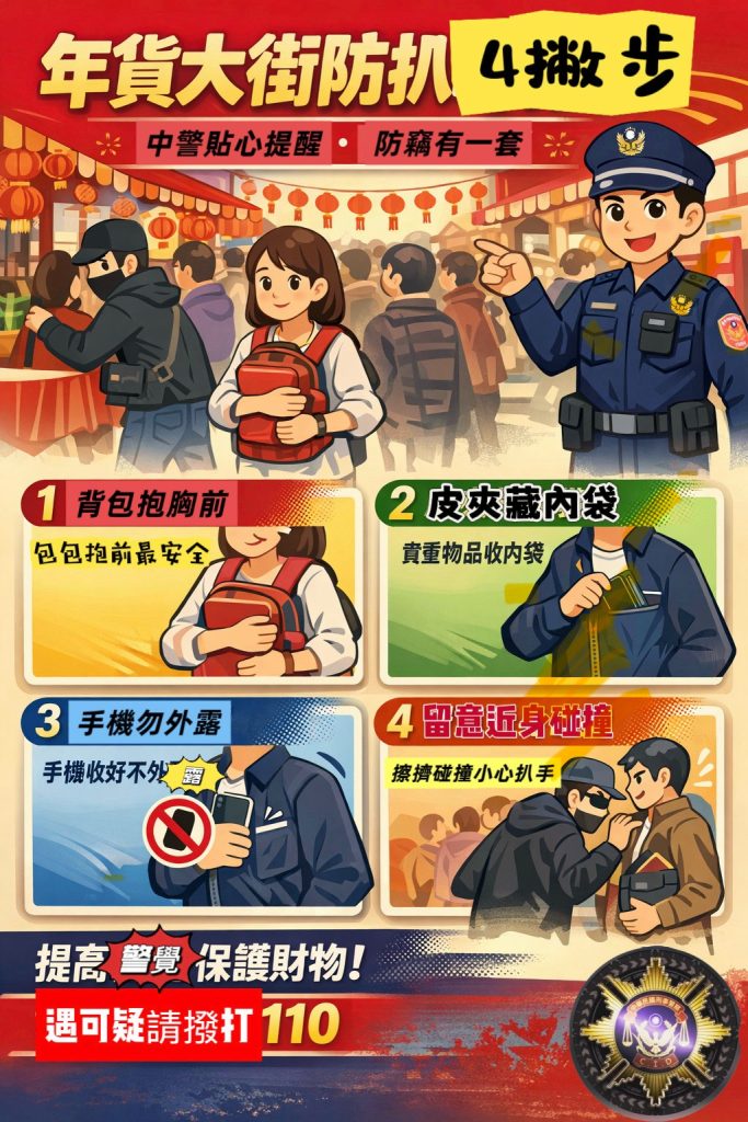 為保障民眾財產安全,臺中市政府警察局刑事警察大隊提醒民眾,應提防扒手偷竊手法,以「背包抱胸前」、「皮夾藏前方內袋」、「手機勿外露」及「近身碰撞遭竊」等4招防範,降低被扒手偷竊的風險。