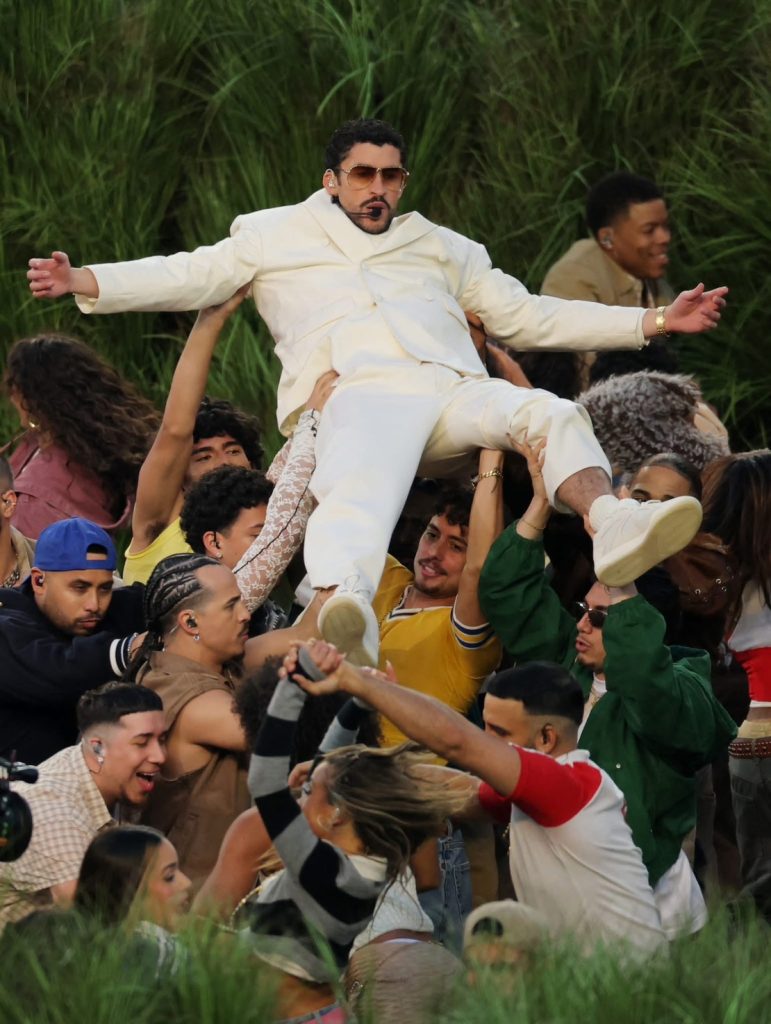 Bad Bunny 站在舞台中央,那身由西班牙品牌 ZARA 量身打造的象牙白剪裁,宛如一封寄往九〇年代的家書。球衣上繡著「Ocasio」與背號「64」,那是他的本名,也是他從超市包裝工走向全球巔峰的來時路。舞台化作了一座名為「Casita」的小屋,骨牌桌、刨冰攤,還有戴著傳統草帽的農民身影,將波多黎各的熱情與憂傷,細細地揉進了主流娛樂的殿堂。