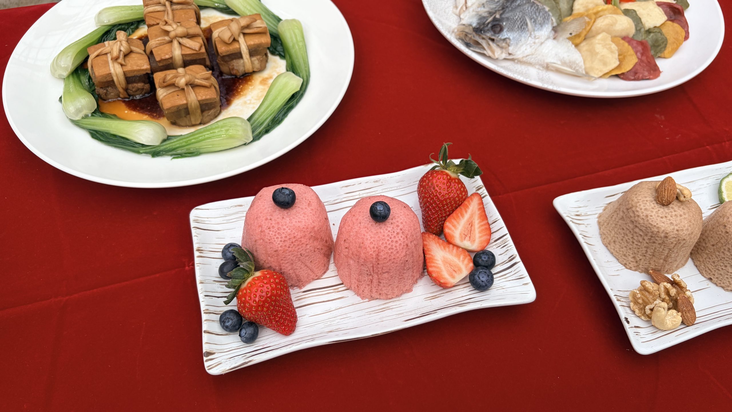 健康版三牲以低脂高蛋白食材取代傳統油膩選擇,讓拜拜後的食物直接變成家常菜。第一牲用質地軟嫩的豬腰內肉取代三層肥肉,脂肪含量低、蛋白質豐富,搭配五香豆干與冬瓜慢煮成改良版東坡肉,入口柔嫩不油膩,保留了傳統東坡肉的香氣卻少了負擔,適合全家享用;第二牲的全雞則以蔥薑八角甘草去腥,滾水悶煮方式讓肉質滑嫩多汁,再淋上天然蔬果莎莎醬取代重鹽胡椒,風味清爽不乾柴;第三牲跳脫整尾魚設計,改用鱸魚製成無刺高蛋白麵疙瘩,細緻魚肉好入口、安全無虞,兼顧優質蛋白與全家老小進食便利。這些調整不僅降低飽和脂肪與鈉攝取,也讓供品在拜完後不會浪費,而是成為溫暖的團圓菜餚。