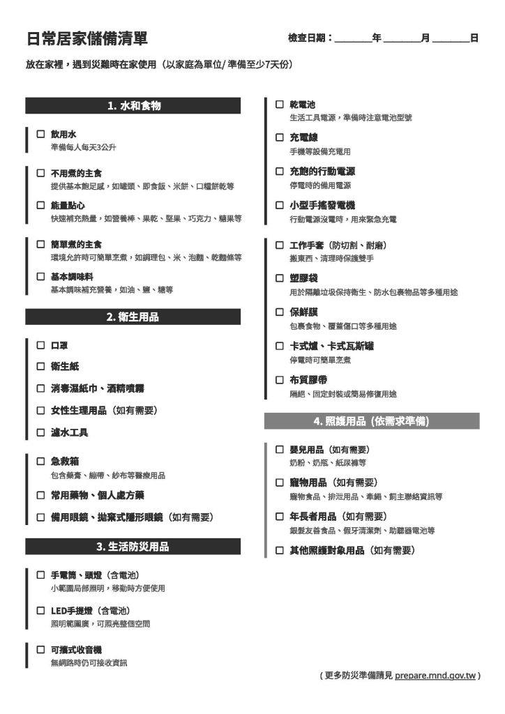 第一部:避難首先要準備防災包。救援資源往往優先投入搶救生命,在外部物資尚未到位前的72小時,家庭是否能穩定應變,關鍵就在事前準備是否充足。建議至少備妥三天份飲用水與糧食,並準備常用藥品與醫療用品、手電筒、行動電源、雨衣及保暖衣物等物資,定期檢視與補充,並放置於隨手可得的位置,以利緊急時刻迅速攜帶避難。