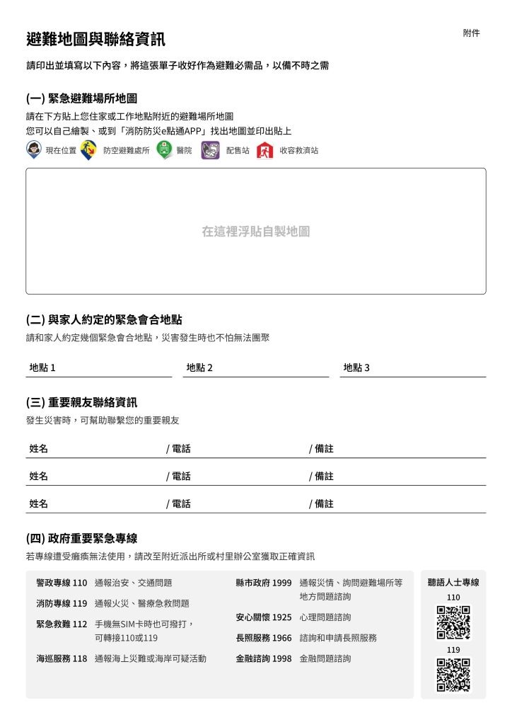 第二部:平時共同討論家庭防災計畫。防災不只是準備避難包,更重要的是事前規劃與分工。透過與家人討論避難場所、集合地點與逃生路線,建立重要聯絡資訊清單並進行簡易演練,可有效降低災時恐慌,提升應變效率,在關鍵時刻守護最重要的家人。