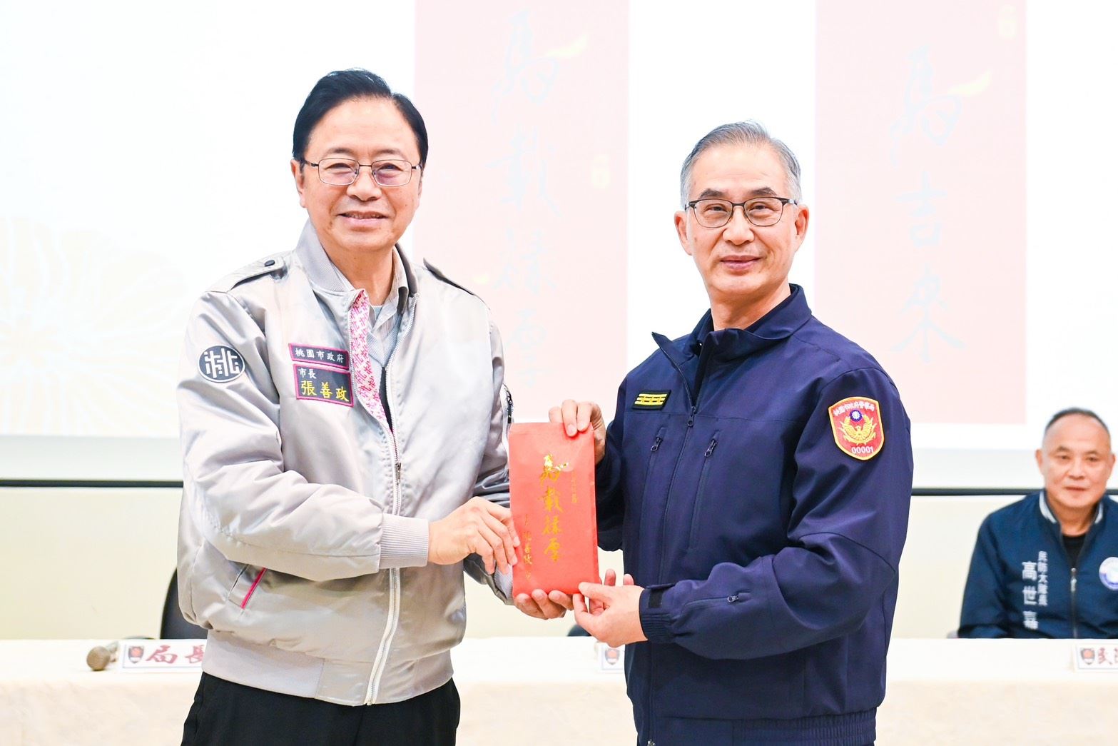 張善政指出,警察局與各民力大隊長期密切配合,攜手守護城市安全,使桃園屢次獲評為全國治安績優城市,社區治安績效更有目共睹,期勉警政與民力團隊持續深化合作,共同為城市發展與市民生活營造更優質、安定的治安環境。