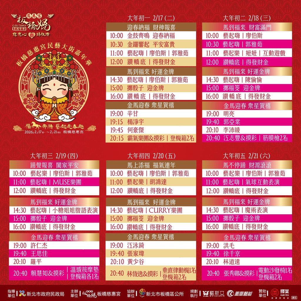 115丙午馬年板橋慈惠宮民藝大街嘉年華活動,今2月10日10時舉辦【115丙午馬年板橋慈惠宮民藝大街嘉年華活動】記者會。今年主題為【慈惠媽祖心 福馬奔騰 藝起走春趣】2月17日大年初一到2月21日大年初五為止每天都有各種熱鬧精彩的活動,除了每天上、下午的精采表演與互動小遊戲拿好禮,以及擲筊與擲骰子拿金元寶、消費摸大獎等好康外,還有大家最期待的鑽轎底領發財金的活動。