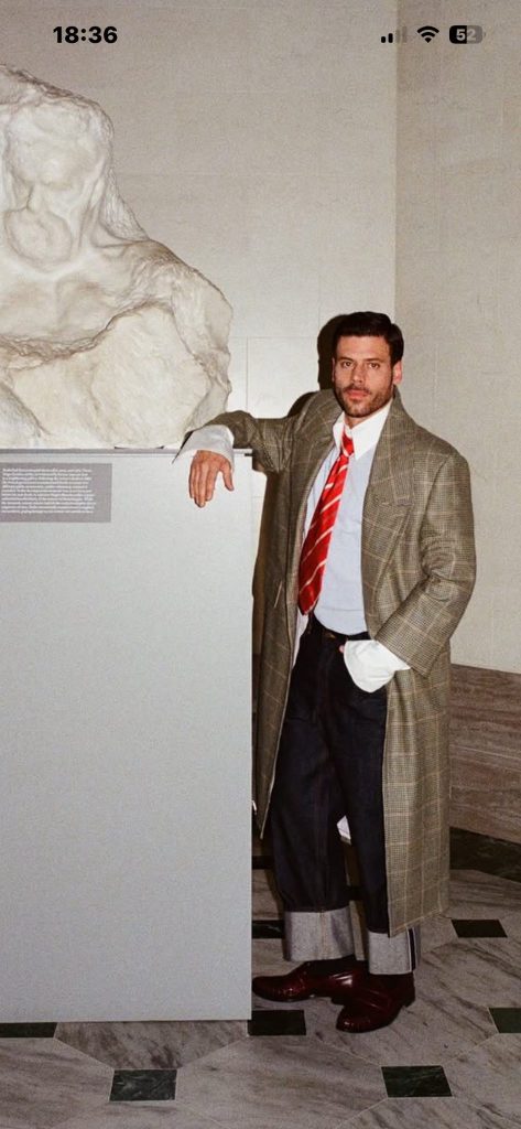 超大廓形格紋大衣、戴著墨鏡,並將領帶隨意塞進寬鬆襯衫袖口的男星Francois Arnaud恰如其分地穿出Thom Browne 略帶叛逆的紳士感。