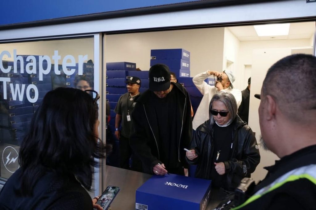 潮流教父 藤原浩(Hiroshi Fujiwara)與 NBA 球星 Devin Booker 近日突襲洛杉磯 Crenshaw High School,現身 Nike 11th Ave Market 活動現場。兩位巨頭親自為現場僅限 300 對的 Fragment x Nike Book 2 “Warning Label” 進行簽名,引發全城潮流信徒瘋狂。
