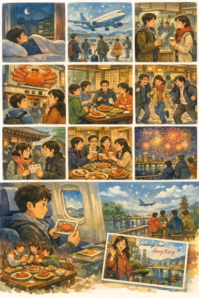 回台灣的飛機上,我翻看手機裡的照片。有那隻大螃蟹,有鎌倉的籤詩,有除夕夜的滿桌菜,有隅田川的煙火。每一張照片背後,都有一個笑話,一個故事,一個相遇。