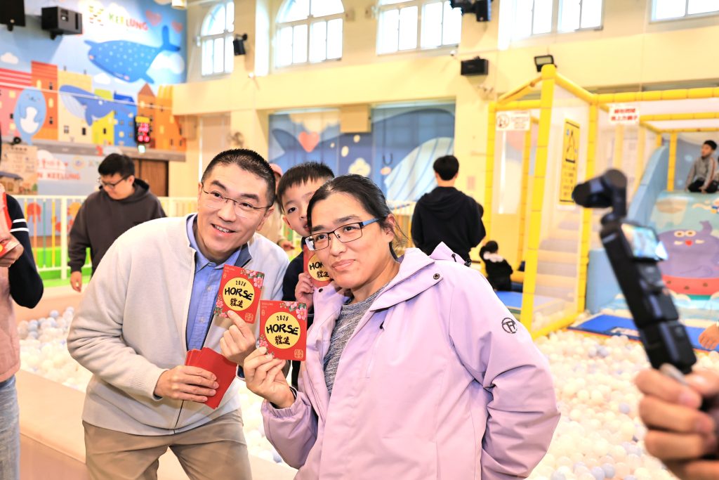 活動現場氣氛熱鬧,謝國樑不時蹲下與小朋友擊掌互動,關心孩子們「好不好玩?」、「最喜歡哪一項設施?」,也與家長交流使用心得,了解實際需求,現場洋溢濃厚年節喜氣與親子歡笑聲。