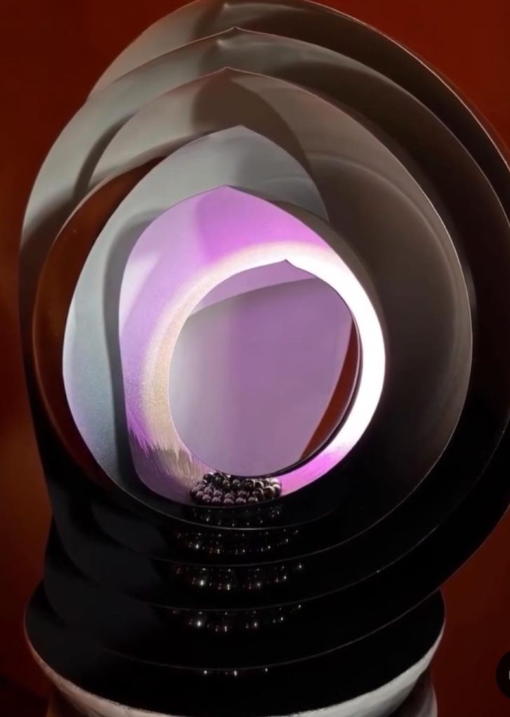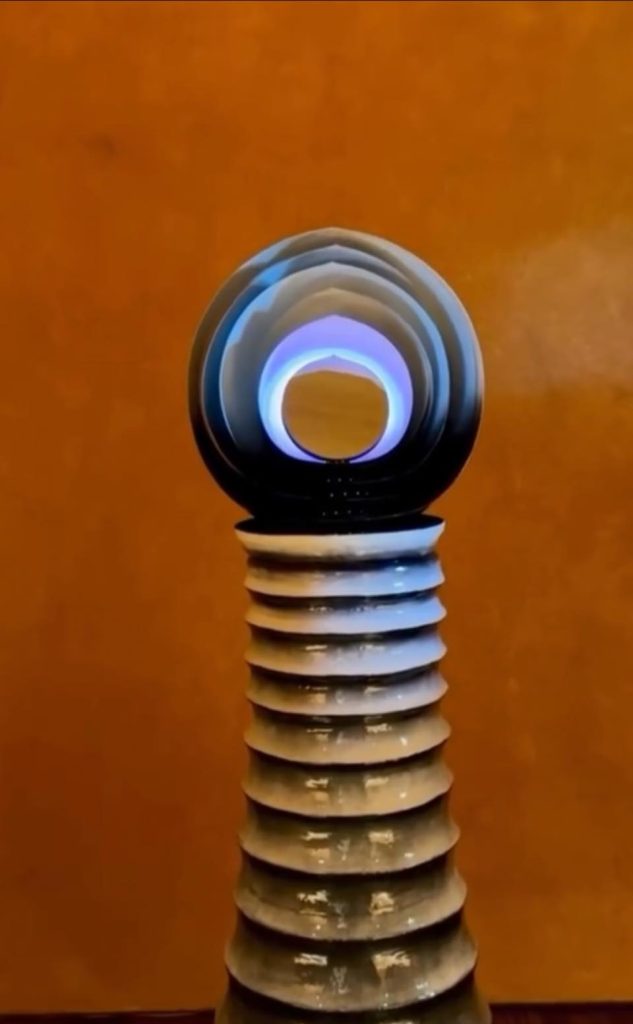 在作品中,那枚半透明的玻璃核心,如同一顆尚未被命名的意識,懸置於垂直上升的節段之上。它既像蓮花未開的種子,也像尚未形成自我的心識。當光從內部緩慢釋放,照亮的是「存在本身」。