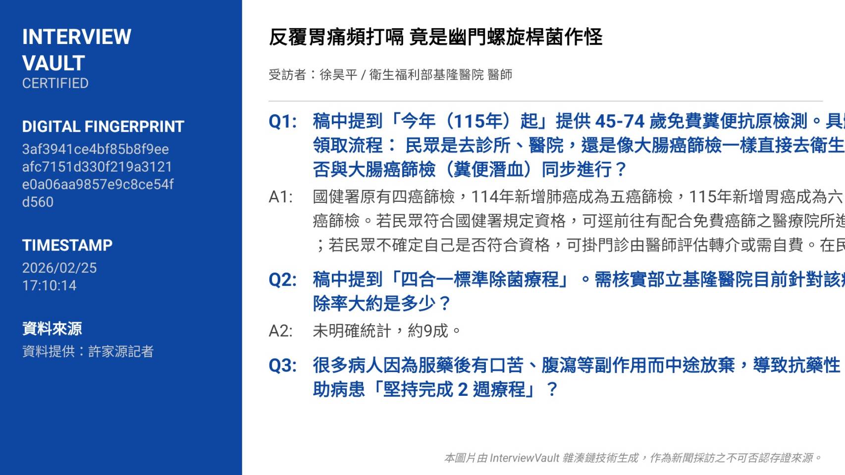 衛生福利部基隆醫院肝膽腸胃科徐昊平醫師表示,今年(115年)起國健署新增胃癌篩檢,45至74歲民眾終生可享一次免費糞便抗原檢測。符合資格者可直接到配合院所檢查,若不確定可先掛門診請醫師評估轉介;未做過胃癌篩檢者,還能用同一份糞便同時完成大腸癌篩檢。徐醫師指出,四合一除菌療程成功率約九成,但很多人因口苦、腹瀉等副作用半途而廢,醫師建議用「為了自己,也為了家人」等正面鼓勵堅持兩週療程。平時用公筷母匙、不共用餐具、注意飲食衛生,就能降低感染風險;胃不舒服超過兩週,務必盡快就醫檢查,早發現早治療才是守護胃健康的關鍵。