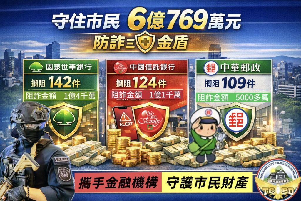 詐騙手法層出不窮,但臺中市守護市民財產的決心更堅定,警察局公布114年7月至12月金融機構攔阻詐騙成果,成功阻止 761件詐騙案件,攔阻金額高達 6億769萬元,為市民守住辛苦積蓄。盧市長於今(115)年市府第一次治安會報中,特別公開表揚臨櫃阻詐成效最亮眼的三家金融機構:包括半年內成功攔阻142件、阻詐金額超過1億4千萬元的國泰世華商業銀行;攔阻124件、阻詐金額逾1億1千萬元的中國信託商業銀行;以及攔阻109件、守住民眾5千多萬元的中華郵政公司,這三家金融機構不僅件數高,阻詐金額也相當可觀,是本市防詐最堅強的防線。