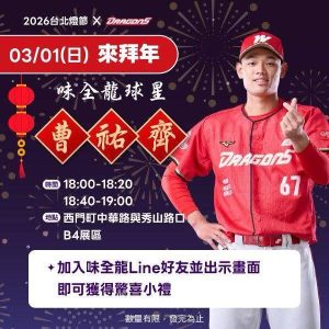 燈節期間味全龍也將舉辦現場活動,3月1日與3月14日18時至19時,味全龍球星曹祐齊與Dragon Beauties小龍女馬妹將分別現身燈區與民眾不定時互動。現場加入味全龍LINE官方帳號並出示手機畫面即可獲得限定小禮。