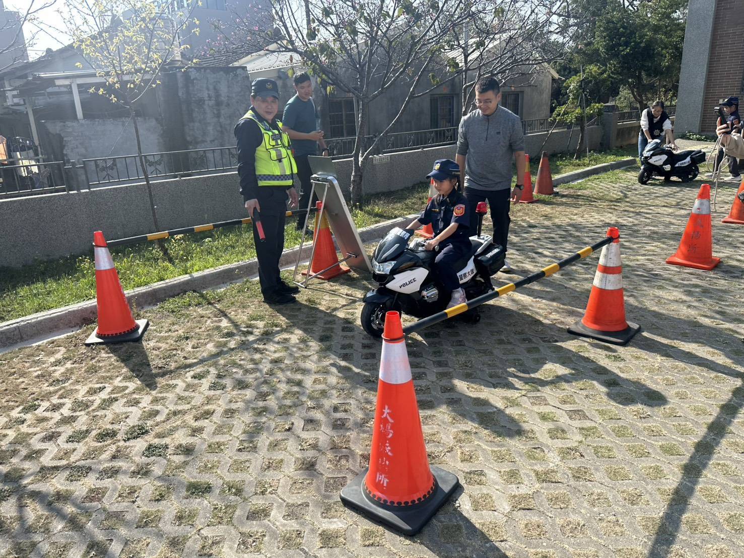 活動亮點為電動警用機車體驗,當警用機車擺在派出所空地時,小朋友發出「哇!哇!…」的聲音,由於大楊所轄區大都為街道小巷口且多為死角,林所長也站在機車前面,向小朋友宣導行人交通安全及各式交通號誌及標線並且讓孩童實地演練「左看、右看、再過馬路」,另外騎車前也宣導正確配戴安全帽、調整帽帶,體驗跨坐姿勢與出發前檢查,並透過實際觀察建立「車輛死角」概念。隨後搭乘警車,練習繫安全帶與兩段式開車門,並學習禮讓行人,讓交通安全教育更具臨場感。