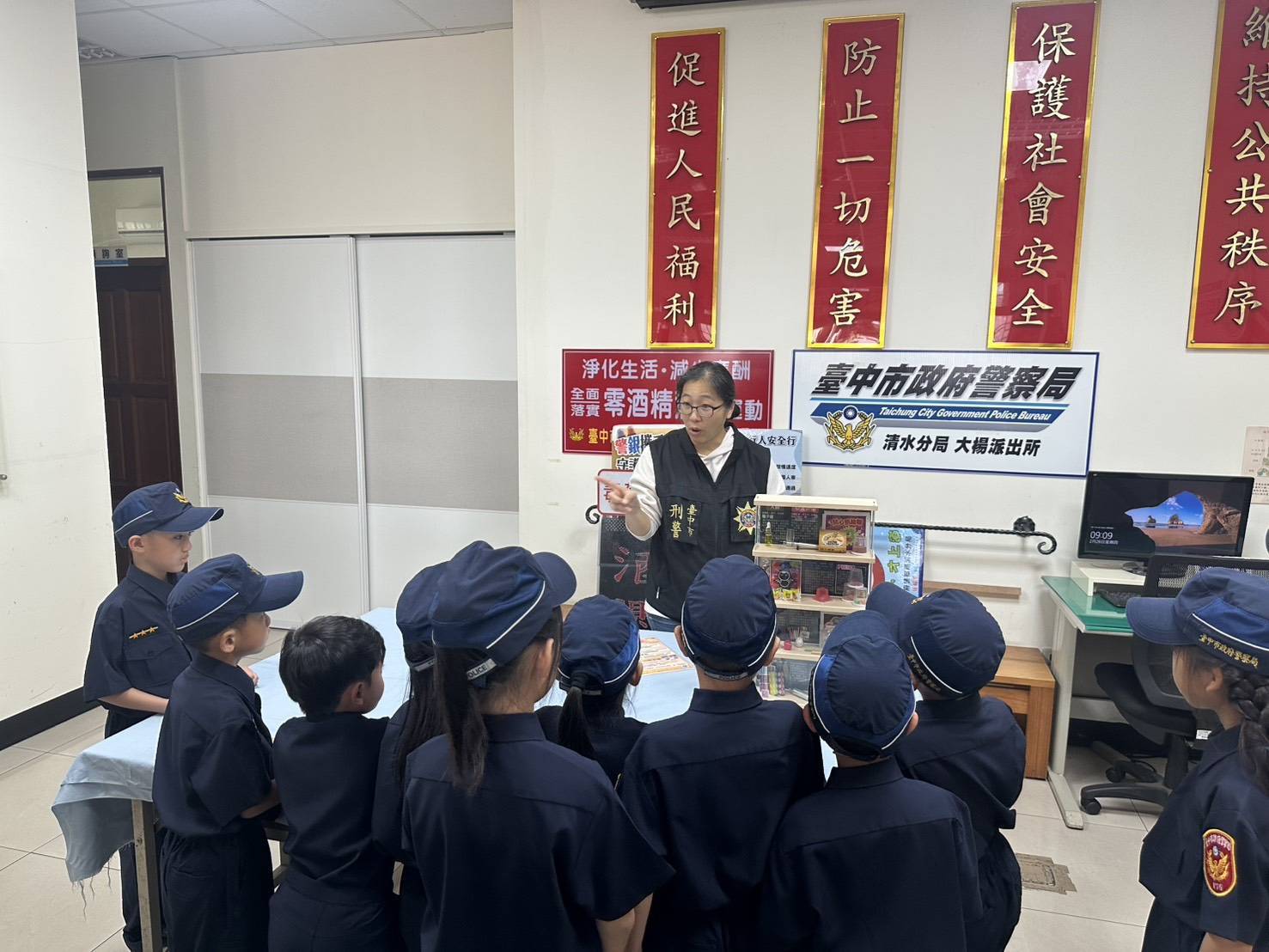 清水警分局大楊所長林士欽及偵查隊偵查佐黃秋菱等人即在大門迎接小朋友,當警方拿出小小警察制服要請小朋友換上時,小朋友臉上掛著興奮的表情,「可以當警察了吔」,穿上制服後也精神抖擻地與員警合影,為本次學習及參訪揭開序幕。