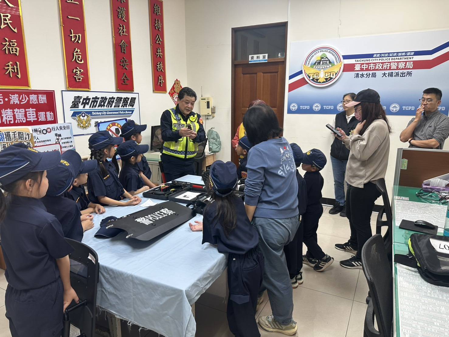 所長林士欽對著小朋友說「當警察首先要先了解自己的裝備…」,並介紹手槍、盾牌、甩棍、辣椒水及手銬等警察裝備及用途,並請小朋友試穿全套裝備,有位小朋友直說「好重喔,我没辦法走路了…」此語一出引發哄堂大笑,林所長也說明警察常年背著裝備維護治安與守護民眾安全,接著進行反毒宣導,黃偵查佐透過「識破變裝糖果」小遊戲,教導孩子辨識可能偽裝成糖果或零食的危險物品,並牢記「不隨便接受陌生人給的東西」「有疑問找大人」原則。員警同時介紹,讓孩子在好奇中理解法治精神。