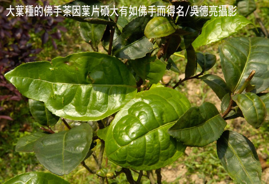 充滿濃濃宗教意味的「佛手」名稱,指的不僅是芸香科中一種清香名貴的水果,也是葫蘆科的一種常見蔬果,更是大葉種的一個茶樹品種,儘管三者分屬全然不同的植物,卻都由於形似佛手而得名:「佛手柑」屬芸香科柑橘屬,果實形如千指佛手,大多作為藥用或觀賞。「佛手瓜」為葫蘆科佛手瓜屬,為台灣常見的蔬果。至於「佛手茶」又稱香櫞種或雪梨,葉片碩大有如佛手;也有人說茶品沖泡後,帶有佛手柑所特有的奇香而得名,獨特的茶香則稱為「佛手韻」。由於價格名貴等同黃金,又有「金佛手」之稱。