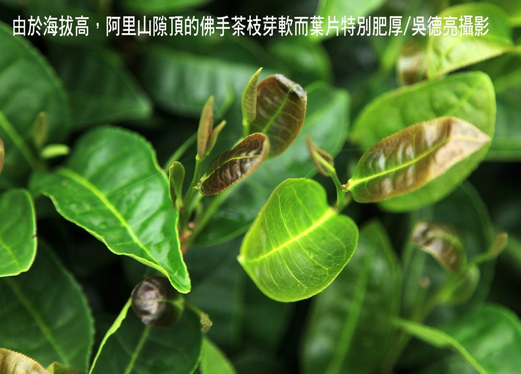 阿里山的佛手茶大多種植在海拔約1350公尺的隙頂與石槕附近,長年的落霧使得當地的佛手茶枝芽軟而葉片肥厚,因此往往會垂下枝葉而無法長高。林君說若不修剪,垂下的枝葉就會落地生根,再長出新的茶樹,生命力十分強韌。