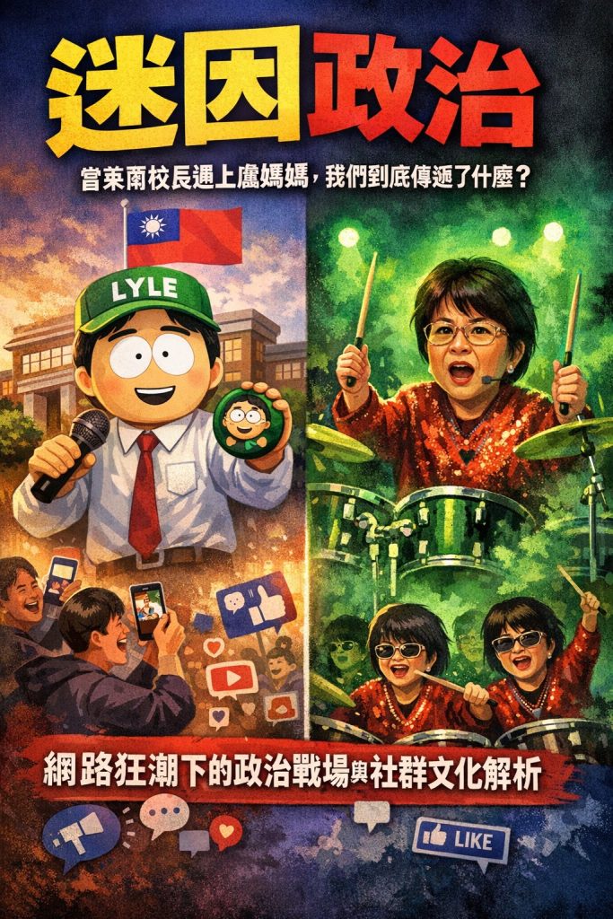 你或許沒看過賴清德的完整政策說明,但一定看過「萊爾校長」用《南方四賤客》的畫風在網路上說唱;你可能不熟台中防疫的SOP,但很難沒滑過「盧媽媽」在詭異綠光下打鼓的迷因畫面。這就是2025年台灣政治的最新縮影:迷因不僅是娛樂,更成為主導議題的關鍵戰場。