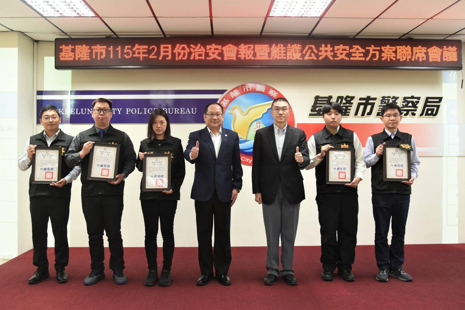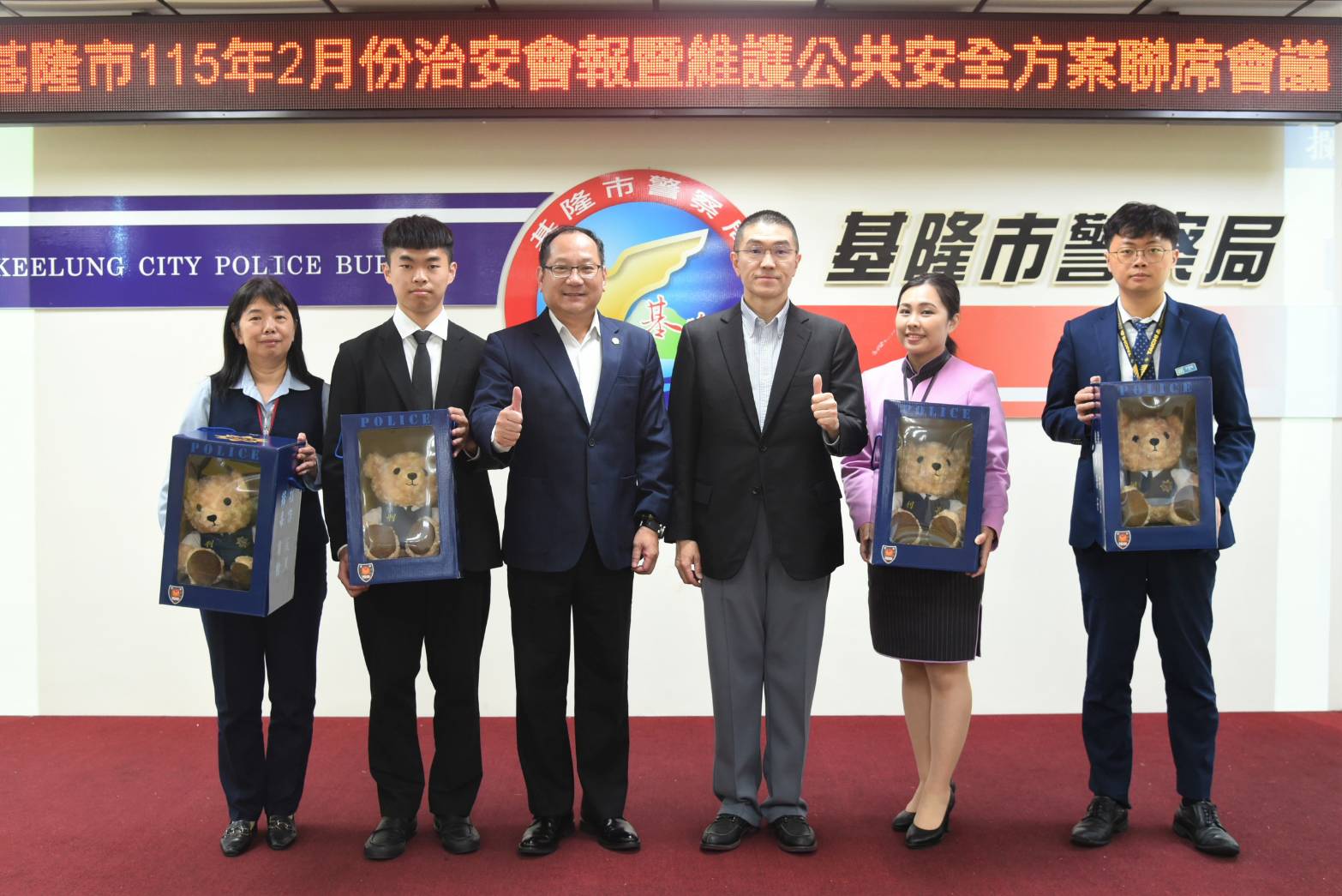 會中頒獎表揚偵破重大刑案及好人好事優良事蹟之警、消同仁,並頒獎表揚基隆市永豐商業銀行基隆分行、中國信託商業銀行基隆分行、台北富邦商業銀行基隆分行等打詐基隆隊的優秀成員,分別於114年12月、115年1月攔阻詐騙金額新臺幣100萬元以上,協助防制詐欺犯罪,守護市民財產安全,期望今後能共同營造安全宜居的社區環境。