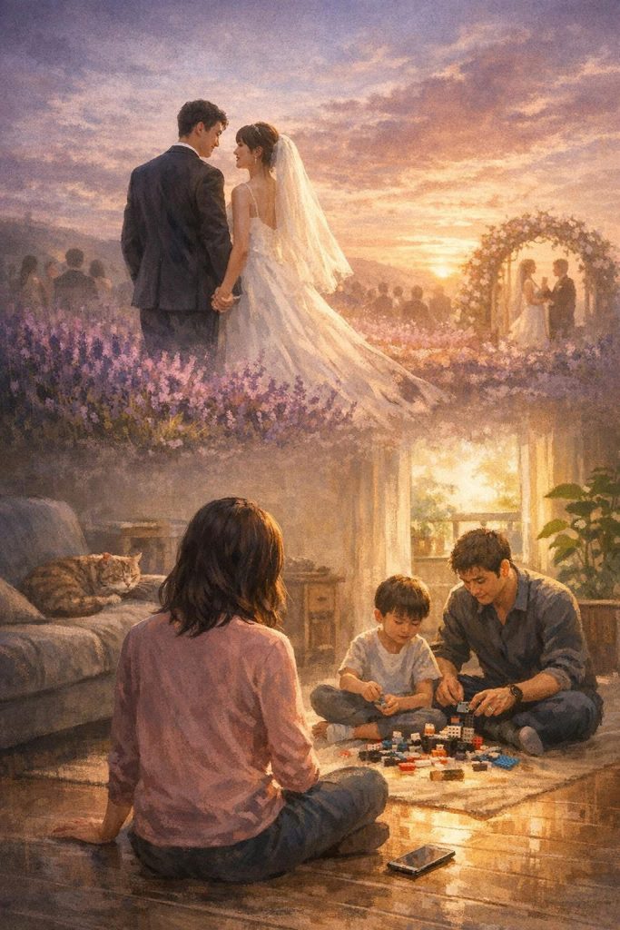 司儀在台上說著套話,什麼「相識相知」「緣定三生」,下面的人配合地鼓掌。她看著台上的兩個人交換戒指、喝交杯酒、擁抱親吻,全程面帶微笑。
