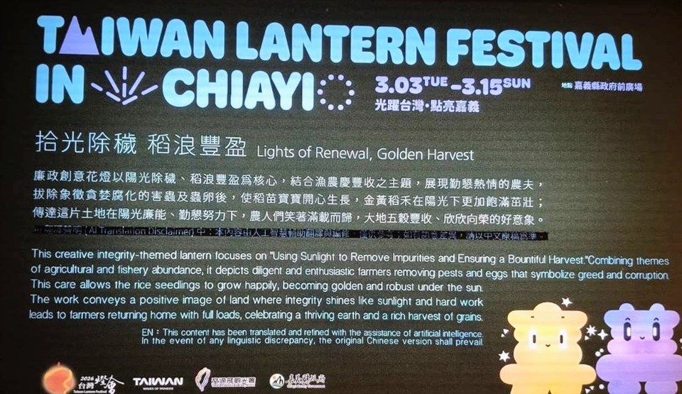 「2026台灣燈會」即將於3月3日至3月15日在嘉義縣盛大登場,觀光署署長陳玉秀表示,今年燈會首創結合生肖「馬」及臺灣觀光代言人「喔熊」,小提燈以喔熊騎在馬上為造型,取名「喔熊馬抵嘉」極富趣味!觀光署另於主展場「農漁慶豐收」燈區,由政風室規劃設置廉政創意花燈,主題為「稻浪豐盈.喜迎陽光慶好年」,以陽光除穢、稻浪豐盈為核心,結合漁農慶豐收之主題,由勤懇熱情的農夫,拔除象徵貪婪腐化的害蟲及蟲卵後,使稻苗寶寶開心生長,金黃稻禾在陽光下更加飽滿茁壯。傳達這片土地在陽光廉能、勤懇努力下,農人們笑著滿載而歸,大地五穀豐收、欣欣向榮的好意象。