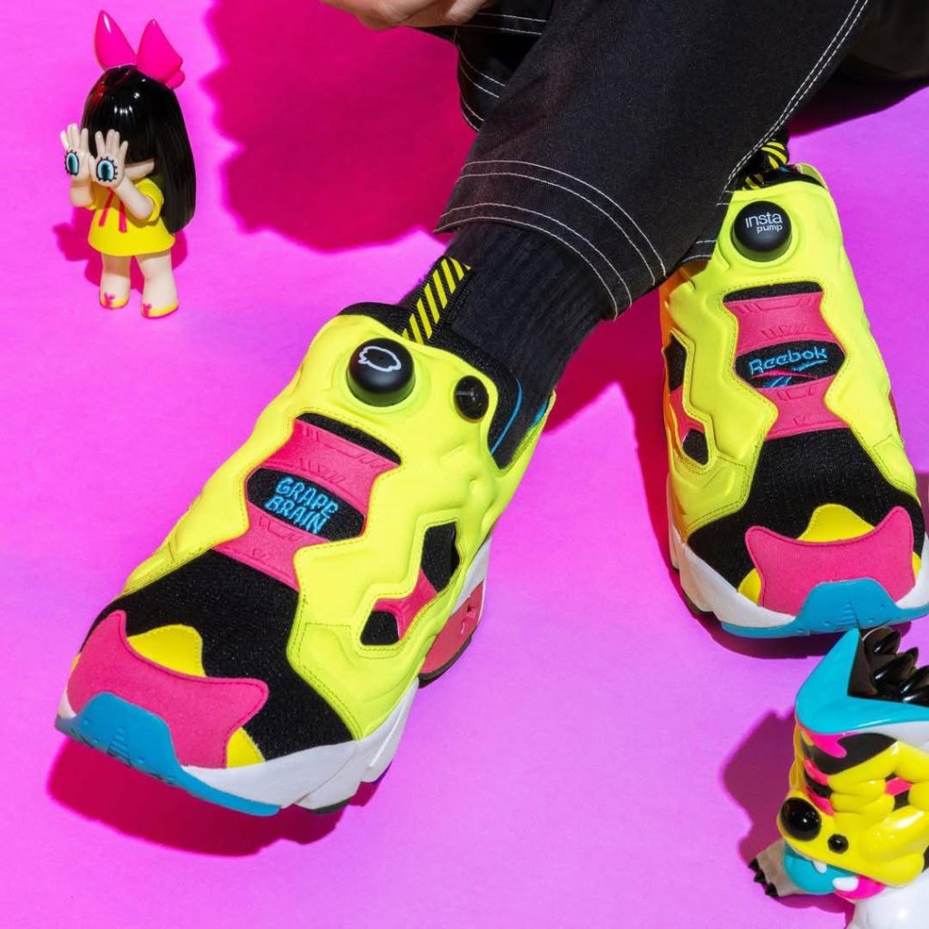 這款三方聯名鞋以經典的檸檬黃 Pump Fury 為畫布,注入了 GRAPE BRAIN 代表性角色「Nigiru-chan」與「憤怒男人」的怪誕美學。設計上將怪獸的器官與釋放原始慾望的意象視覺化,透過鮮豔的對比色呈現怪獸化的生活方式。