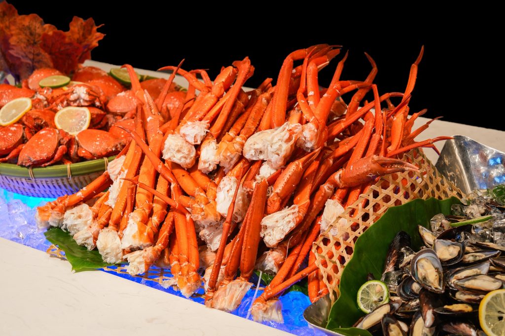 頂級肉食與海鮮盛宴:首推視覺焦點「肉食.狂歡」,集結爐烤牛排、香草羊腿及美式BBQ豬肋排,搭配多達12種佐醬;「集鮮.碼頭」則匯聚多種冰鎮海鮮,假日更加碼提供雪蟹腳與毛蟹腳無限享用。